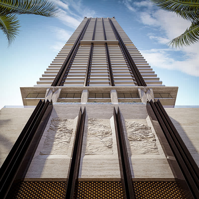 A facade of Roman travertine exudes a timeless elegance that has adorned many of the world's most iconic buildings. Combined with sculptural matte black steel beams, the building has an expressly vertical appearance, setting it far apart from its neighbors, standing at 1,049 feet tall.